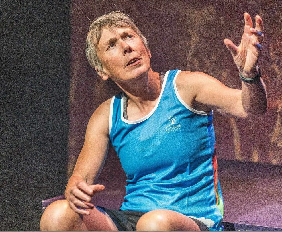 The piece is 60 minutes of vulnerable and humorous poetry, where Jules Carter, a fell runner from Keswick, explores everything that has built the story and experience of fell running for her: the history of the sport, the place of the lakes, the people, her body, the pain, the weather, the ableism, misogyny, her own self doubt. It moves rapidly and quickly, her poetry enrapturing and not at all obtuse. There is stage light work and a sprinkling of music. Jules ropes in local running clubs to provide the audience participation we were all dreading, which is funny and a great way of bringing local communities into a moving, flowing piece. Many of us recognise the runners on stage; we’ve run with them, seen them at races and the community events we’re part of. It draws us in. Jules blurs the line between poetry and theatre and her sport. There is no start, there is no end in either. It’s all about how you experience them, and it’s the first time I've ever seen quite such a creative reconstruction of that idea.